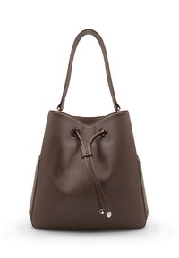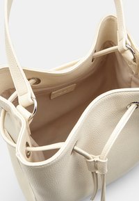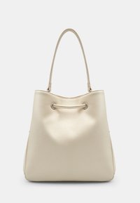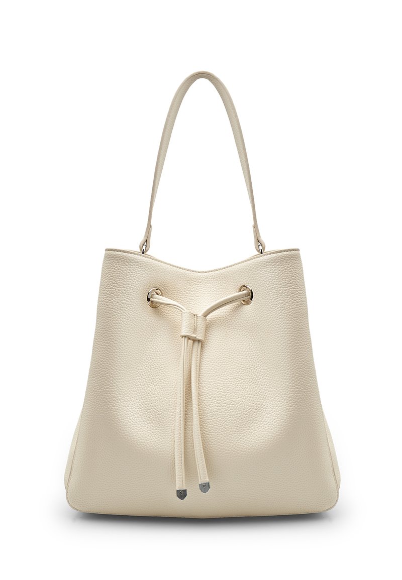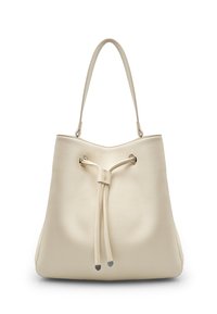 Kremfarvet læderbøtte taske med snorlukning, to lange håndtag og subtil tekstur. Sølvfarvede metaldekorationer på spidserne.