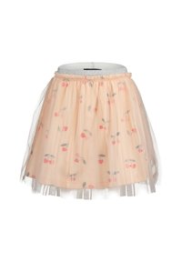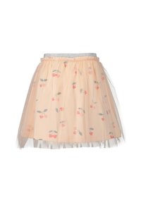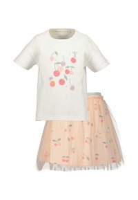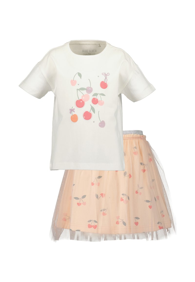 Hvid kortærmet skjorte med kirsebærprint kombineret med ferskenfarvet tylskørt dekoreret med små kirsebærmønstre og sølvfarvet taljebånd.