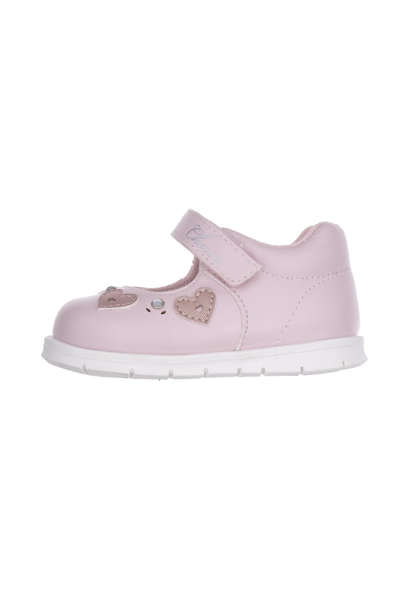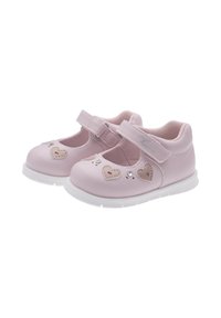 Lyserød læder Mary Jane-sko med rundet tå, hvid sål og hjerteformede pyntedetaljer. Justerbar rem for nem påtagning.