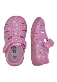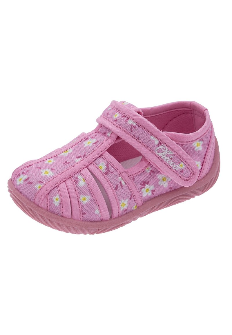 Lyserød småbørnsko med tusindfryd-blomstermønster, justerbar rem og gummisål, designet til komfort og nem brug.