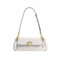 Olivengrøn læder skuldertaske med guld "C" lås, justerbar rem og Coach-logo tag på hvid baggrund.