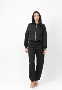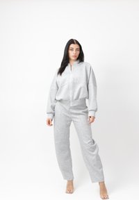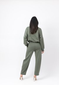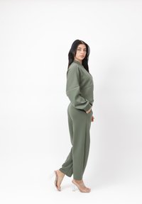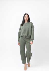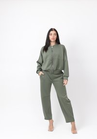 Kvinde med langt mørkt hår iført olivengrøn lynlåstrøje og matchende bukser, der går fremad mod en ensartet hvid baggrund.