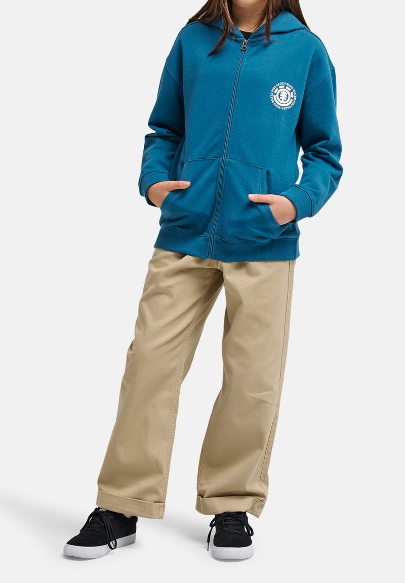 Person iført en turkis lynlåshoodie med logo, beige bukser med vide ben og sorte sneakers, stående med hænderne i hoodie-lommerne.