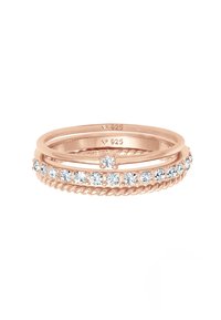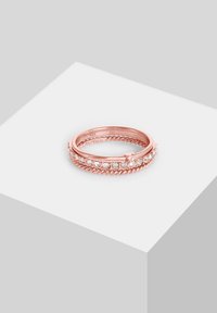 Et smukt ringsæt håndlavet af det fineste rosaforgyldt 925 sterling sølv, der hurtigt fanger øjet. En funklende solitærring med en strålende krystal kombineres med en subtilt snoet stabelring. En delikat båndring i memoire-design giver et glamourøst skær. Uanset om den bæres enkeltvis eller i kombination, er dette ringesmykke velegnet til enhver lejlighed og begivenhed. I dette smykkesæt forenes højkvalitetsmaterialer og perfekt koordinerede former til et trendy statement-ringsæt.