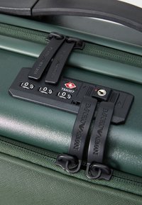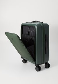 Hårdført kuffert i mørkegrøn farve med en glat overflade, sort teleskophåndtag og fire sorte hjul for nem mobilitet.