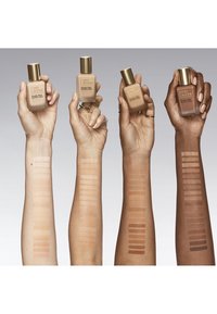 Omryst – tryk én gang, hvis der anvendes en pumpe, og kom lidt af produktet på fingerspidsen. Prik – påfør på områder, hvor der ønskes mere dækning, såsom kinder, pande og hage. Udton – fra midten af ansigtet, og udad med fingerspidserne, en svamp eller en pensel. Gentag – opbyg efter behov, indtil den ønskede dækning er opnået. Lad hvert lag tørre, inden der påføres et nyt. Tryk produktet ind i huden med fingerspidserne for at skabe en naturlig finish.