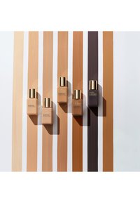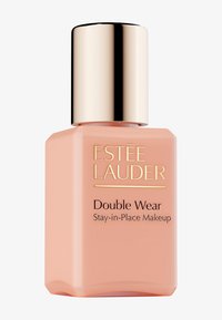 Estee Lauder Double Wear foundation i en rektangulær glasflaske med en ferskenfarvet nuance, guldaccenter på hætten og etiketten, tekstureret overflade.