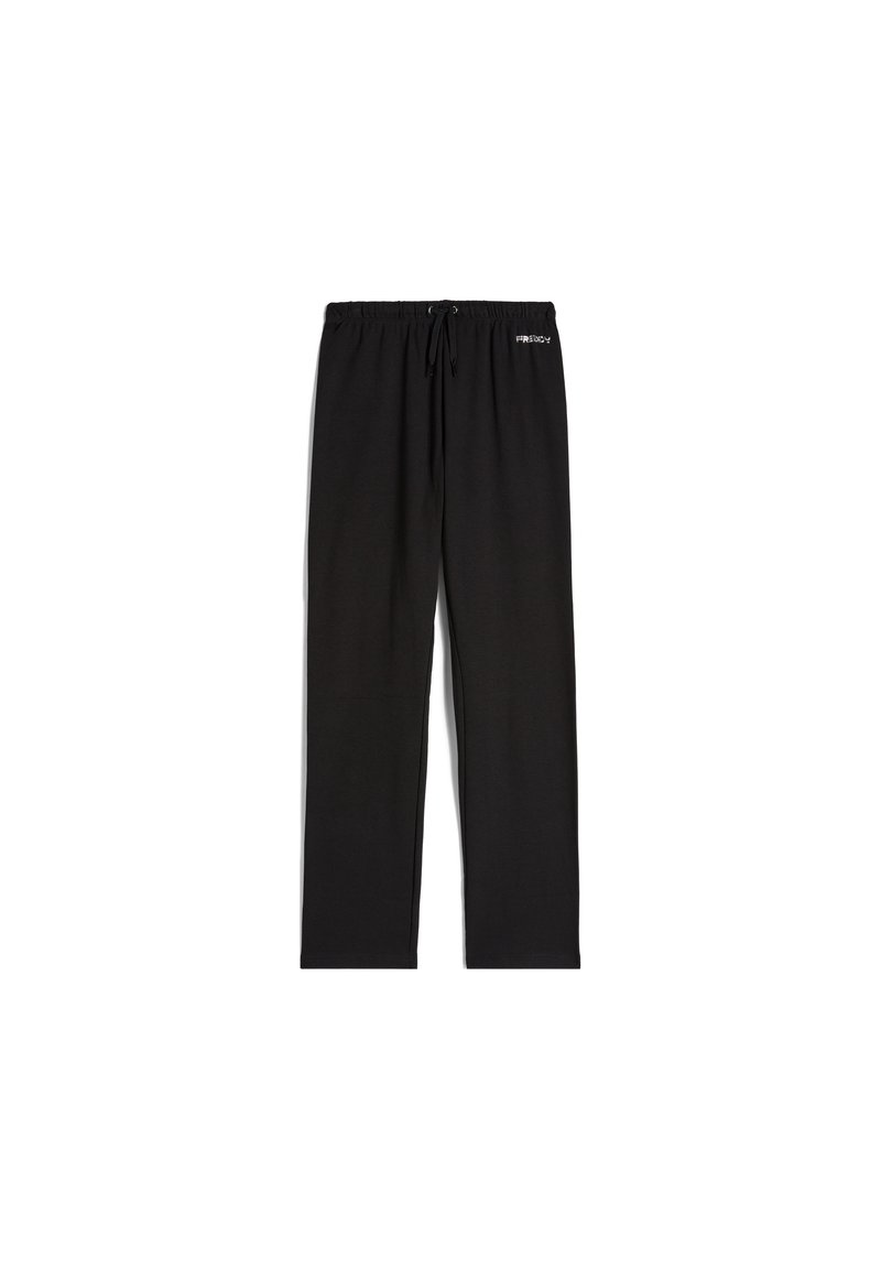 Sorte joggingbukser med snøre i taljen, lavet af blødt stof. Har sidesømme og en lille logo på venstre lår.