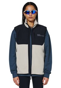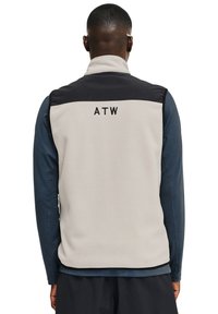 Fleecejakke med høj krave, en cremet krop og sorte og mørkeblå accenter. Broderet "ATW" logo på ryggen.