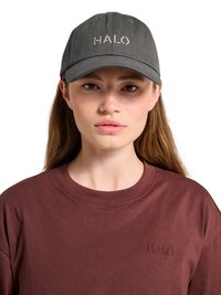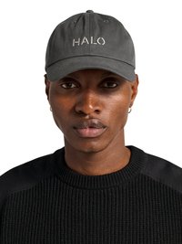 Ung person med mørk hud, der bærer små hoop øreringe, en sort strikket sweater og en mørkegrå baseballcap broderet med "HALO" med hvide bogstaver.