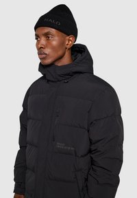 Sort pufferjakke med lynlås foran, hætte og logo-detalje. Har tykke, quiltede paneler og en afslappet pasform. Bæres med matchende mørke bukser.