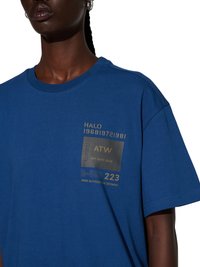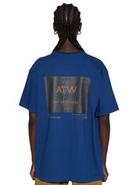 Blå bomuld t-shirt med et stort sort grafisk print med gyldne tekster og motiver, inklusive "ATW" og "OFF DUTY GEAR." Kortærmet.
