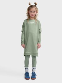 Ung pige med blondt hår sat op i to knolde iført en lysegrøn lang sweatshirt, matchende leggings, hvide sokker og blå sneakers, stående med benene spredt.