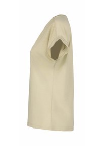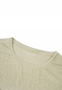 Lyse khaki t-shirt med en glat tekstur, korte ærmer og et delvist gennemsigtigt øverste design med et subtilt mønster.