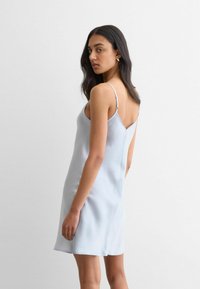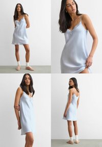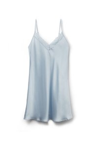 Kvinde med langt, mørkt hår iført en lyseblå satin-natkjole med blonder, stående mod en ensfarvet hvid baggrund.