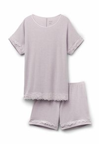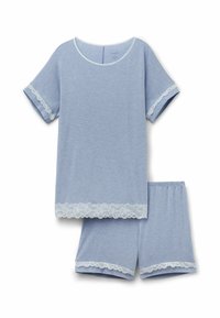 Cremefarvet loungewear-sæt bestående af en kortærmet top og shorts, accentueret med delikate blondekanter ved ærmerne og kanten.