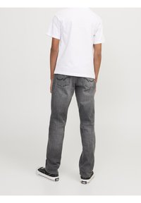 Grå denimjeans med lige snit, fem lommer og diskrete syningsdetaljer. Båret med sorte sneakers med hvide detaljer.
