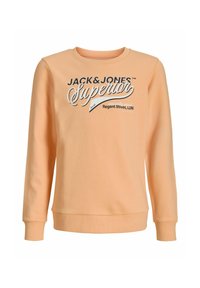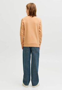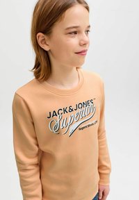 Ung person iført ferskenfarvet sweatshirt med teksten "Jack & Jones Superior", løse blå jeans og hvide sneakers, stående mod en ensfarvet baggrund.