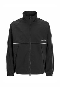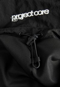 Sort lynlåsjakke med høj krave, hvid piping henover bryst og ærmer, elastiske ærmekanter og lille hvid "project core"-logo på venstre bryst.