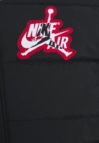 Sort dunjakke med grå accenter, hætte, frontlynlås og sidelommer. Har en rød inderside og et rød-hvidt logo på brystet.