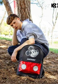 Sort rygsæk med stort Mickey Mouse-ansigt, teksten "MICKEY" og en skinnende rød frontlomme med to store hvide knapper.