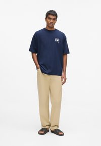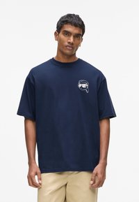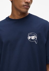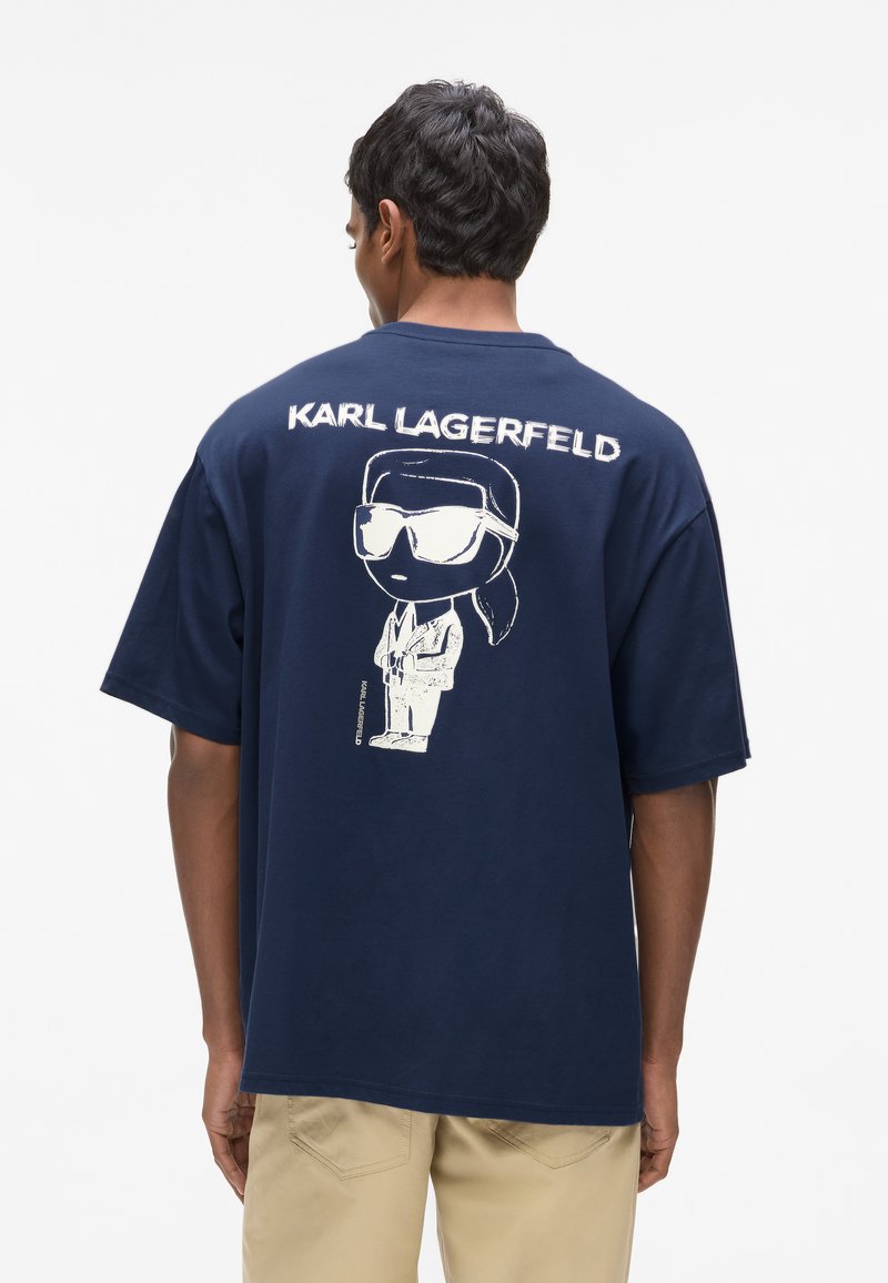 Marineblå bomulds-T-shirt med et grafik af en figur med solbriller på bagsiden, med "KARL LAGERFELD" trykt ovenover i hvid tekst.