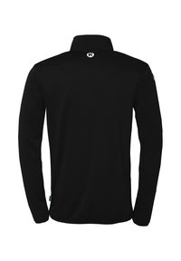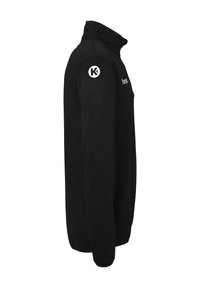 Sort fleece pullover med en halv lynlås, der har en høj krave og hvid "Kempa"-logo på brystet. Glat tekstur og lange ærmer.
