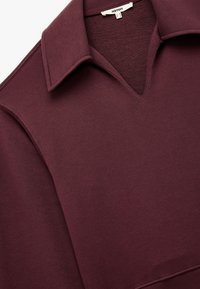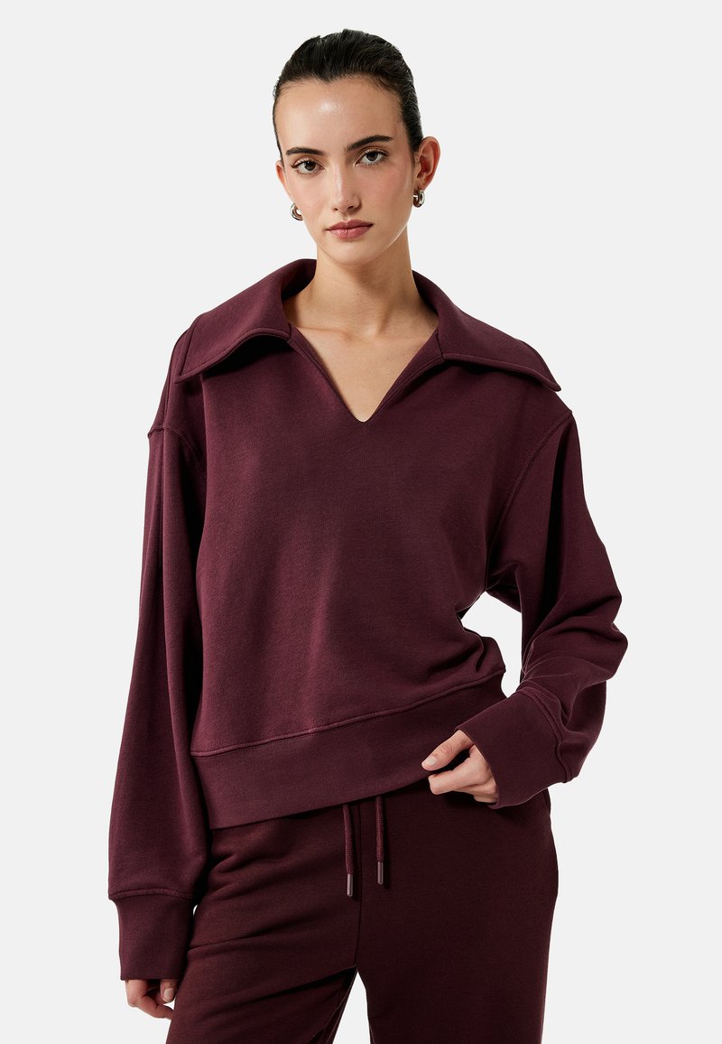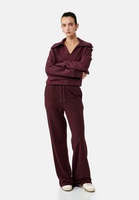 Kvinde iført matchende mørkerød sweatshirt med bred krave og matchende snorbukser, stående mod en ensfarvet lys baggrund.