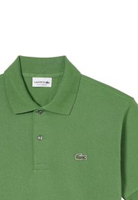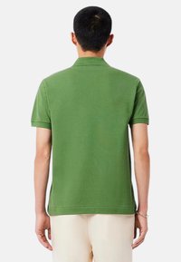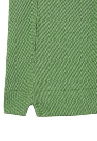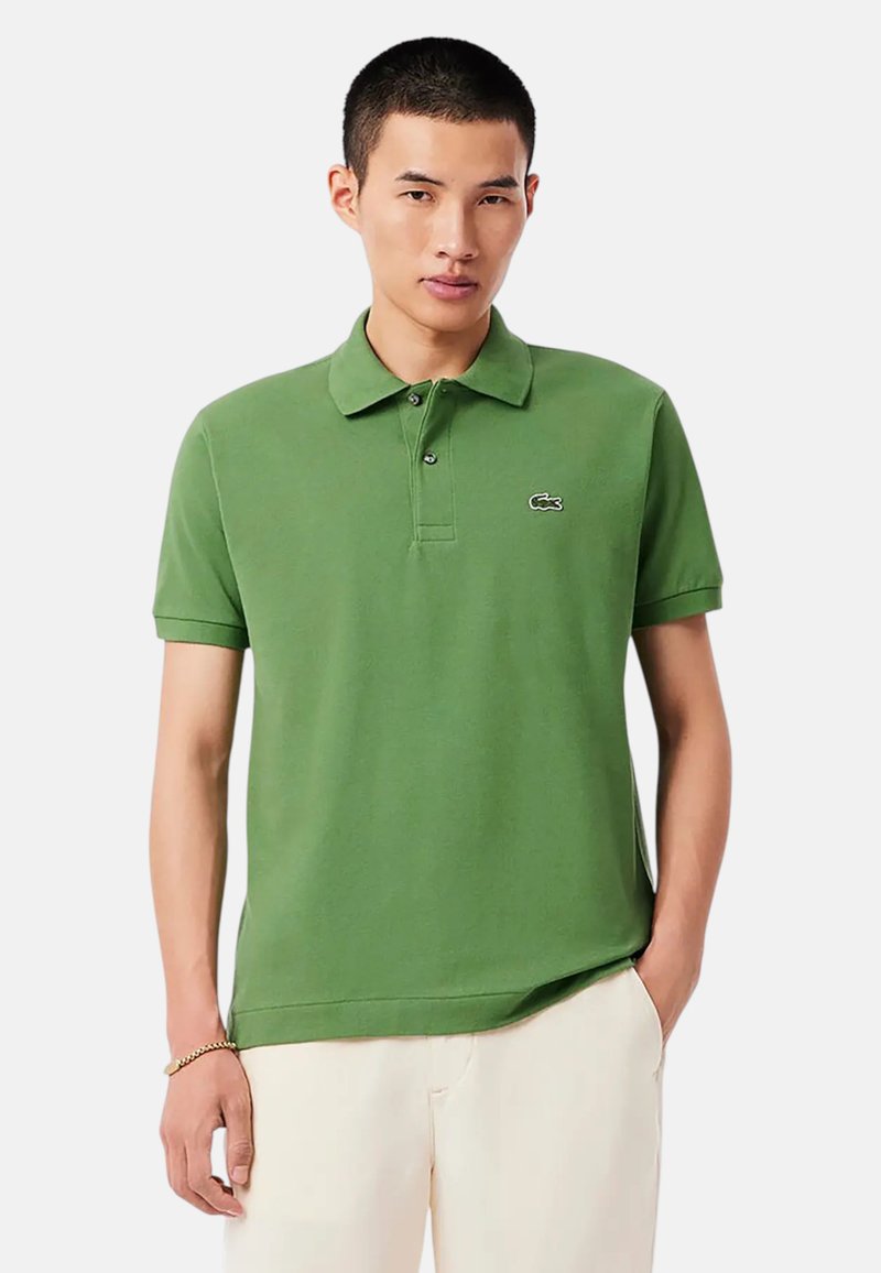 Mand iført grøn kortærmet poloshirt med lille krokodillelogo, beige bukser og guldbøjle, stående med den ene hånd i lommen.