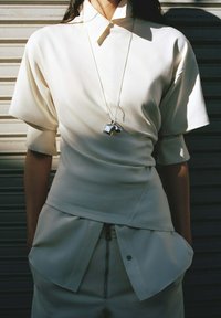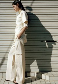 Kvinde iført cremefarvet outfit med vide bukser og opkærede ærmer står sidelæns mod en metaljalousi med hænderne i lommerne og kaster en skarp skygge.