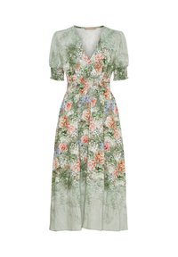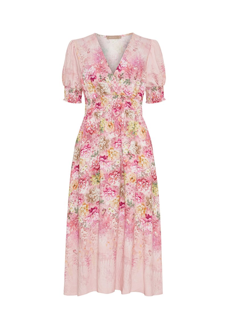 Blomster maxi kjole i blød pink stof, med V-hals, pufærmer og elastisk talje med en afslappet pasform, pyntet med farverige blomstermønstre.