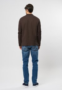 Mand med mørkt hår iført en mørkebrun langærmet polotrøje og blå jeans foran en ensfarvet lys baggrund.