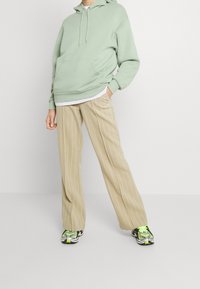 Person iført lysegrøn hættetrøje med forlomme og beige bukser med smalle striber, hvid skjorte under.