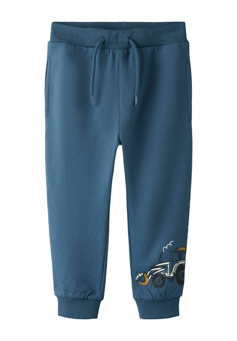 Blå joggebukser til børn med elastik i taljen, snøre, sidelommer og en traktor grafik nær højre ankel.