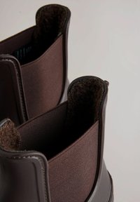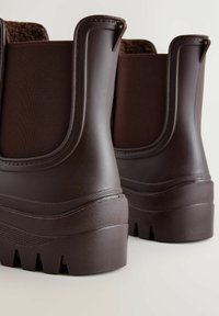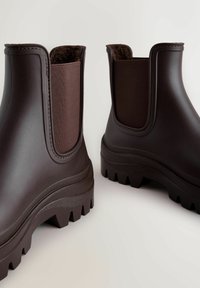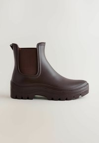 Brune Chelsea-støvler i gummi med struktureret finish, elastiske sidepaneler og kraftigt mønster på sålen for godt greb. Klassisk ankelhøj design.