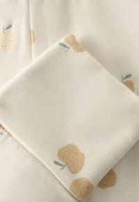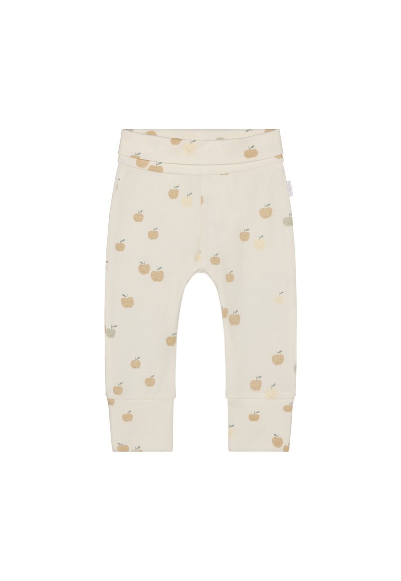 Beige bomuldsleggings med mønster af små æbler i creme, lys gul og grøn. Med manchetter forneden og en blød, elastisk talje.