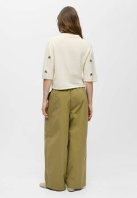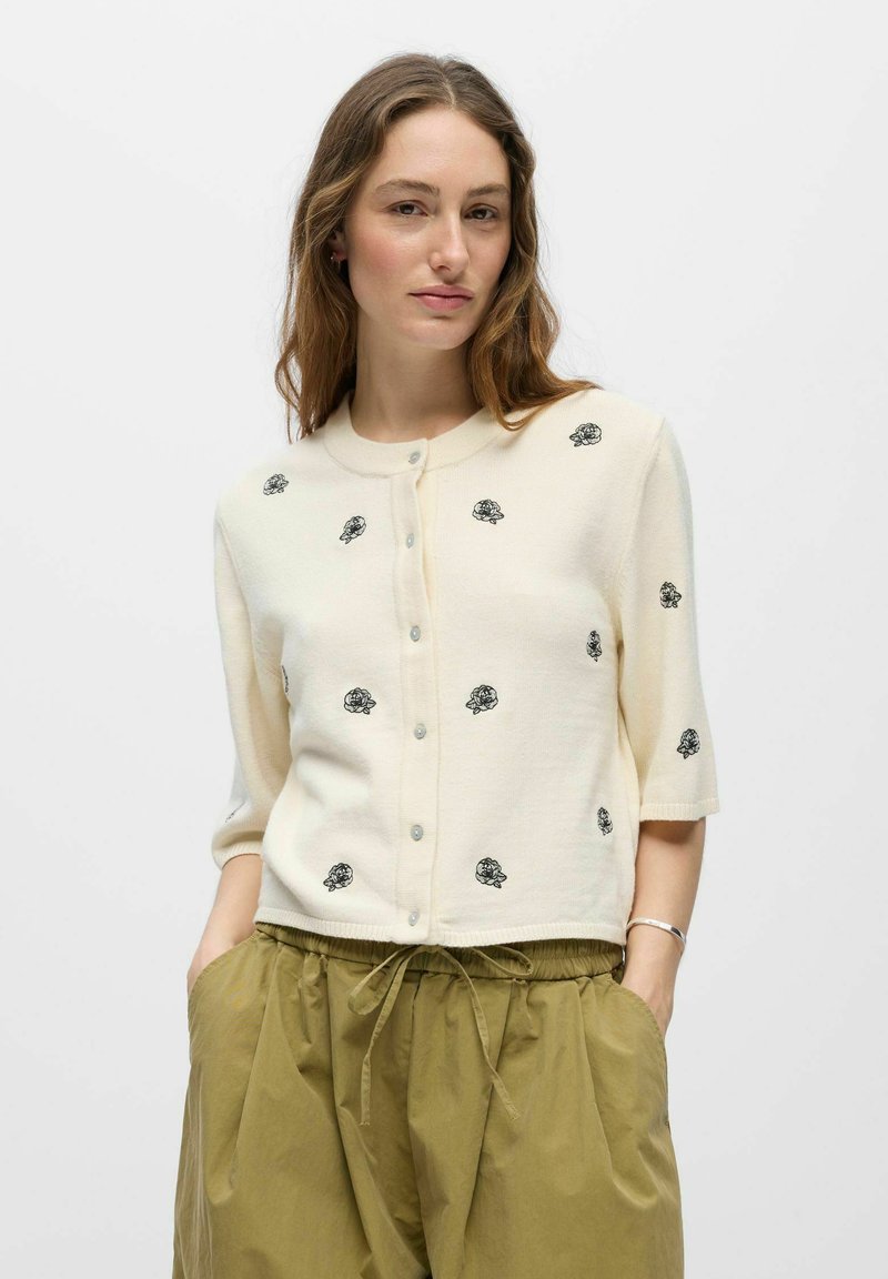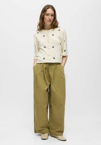Kvinde med langt brunt hår iført en cremefarvet cardigan med knapper og sort blomsterbroderi samt olivengrønne bukser med snøre.