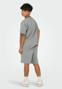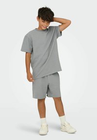 Dreng iført matchet gråt tekstureret kortærmet skjorte og shorts, hvide sokker og hvide sneakers, står med den ene hånd på hovedet.