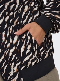 Kvinde iført en sort og beige dyreprintet lynlåsjakke, sort top og løse olivengrønne bukser, poserende med den ene hånd i lommen.