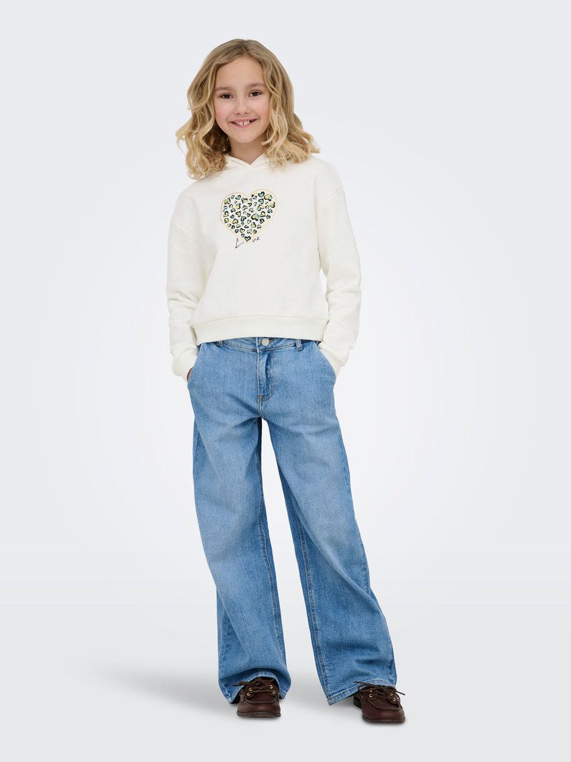 Smilende barn med blondt krøllet hår iført hvid hættetrøje med leopardhjerte-design og viddeblå jeans med brune sko.