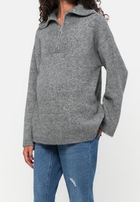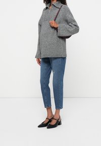 Gravid person iført grå sweater, lysegråt graviditetsbånd, blå slidte jeans og sorte Mary Jane-sko med hæl.