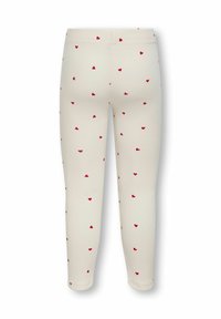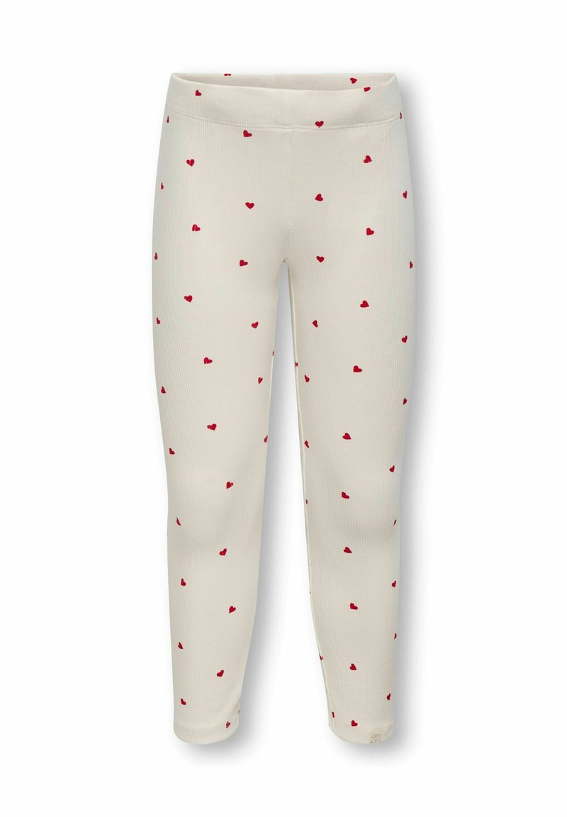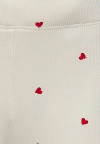 Hvide leggings med ribbet tekstur, prydet med et mønster af små røde hjerter, der er jævnt fordelt over hele. Elastisk talje uden lukninger.