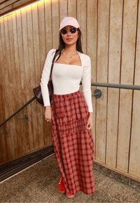 • Kvinde iført hvid top med firkantet halsudskæring, rød ternet maxinederdel, lyserød kasket, solbriller, røde sneakers og bærende en brun håndtaske på trapper foran en trævæg.