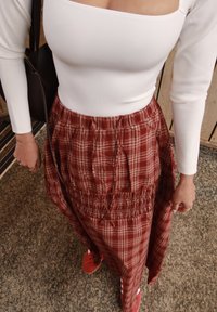 • Kvinde iført en hvid langærmet top, rød ternet nederdel og røde sneakers, stående på en tekstureret gulv med en sort taske over den ene skulder.