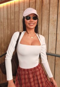 • Kvinde iført hvid langærmet top, rød ternet nederdel, lyserød kasket, solbriller og røde sko, stående ved en trævæg med trapper i nærheden.