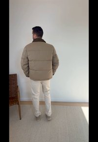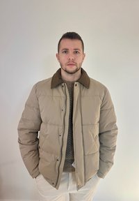 • Mand med kort hår iført en beige dunjakke over en brun sweater og hvide bukser, stående mod en ensartet lys baggrund.