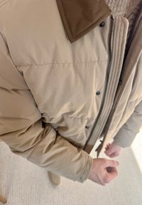 • Person, der lynlåser en beige, polstret jakke med en brun krave, set fra en ovenover vinkel.