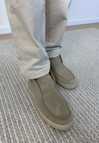 • Person iført beige ruskind slip-on sko og cremefarvede kordfløjlsbukser, stående på et tekstureret gråt tæppe.