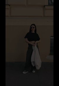 • Kvinde med glat mørkt hår iført solbriller, sort croppet t-shirt, brune brede bukser, holder en hvid jakke med prikker over skulderen.