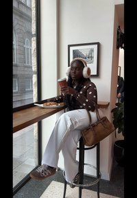 • Brun polkaprikket langærmet top, hvide bukser med vide ben, hvide pelsørevarmere. Holder en kaffekop ved siden af et wienerbrød på et træbord.